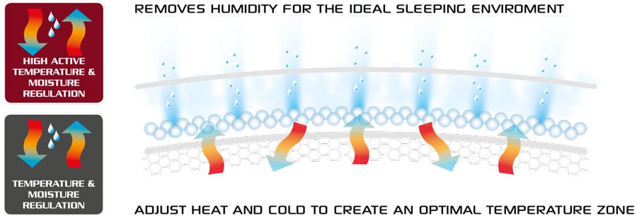 Outlast materialen kunnen warmte absorberen, opslaan en weer afgeven. Outlast beheert warmte en vocht in bed op een uitstekende manier, dit gebeurd doordat het materiaal verandert van vaste naar vloeibare toestand en weer terug naar vaste toestand, vergelijk het maar met water wat in ijs kan veranderen en weer terug in water. Tijdens zo’n veranderingsfase worden grote hoeveelheden warmte geabsorbeerd of vrijgegeven.