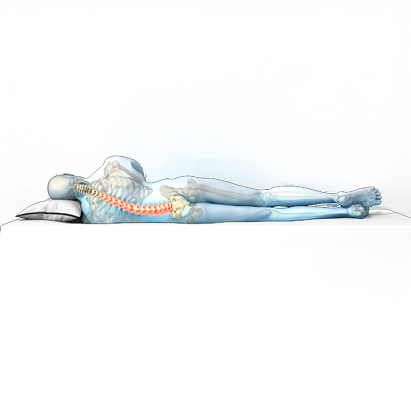 Ga in zijligging op uw matras liggen, ontspannen met licht gebogen benen. Dit geeft hetzelfde beeld als rugligging en maakt de ondersteuning van uw wervelkolom goed zichtbaar. Houd rekening met het volgende: